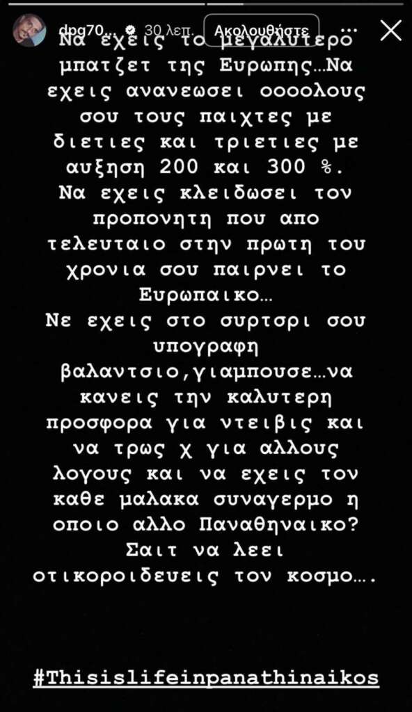 Ωστόσο, μία ανάρτηση του ισχυρού άντρα της ΚΑΕ Παναθηναϊκός, Δημήτρη Γιαννακόπουλου, υποδεικνύει πως -πιθανότατα- η έκβαση της εν λόγω μεταγραφής δεν θα έχει αίσιο τέλος για το «Τριφύλλι».