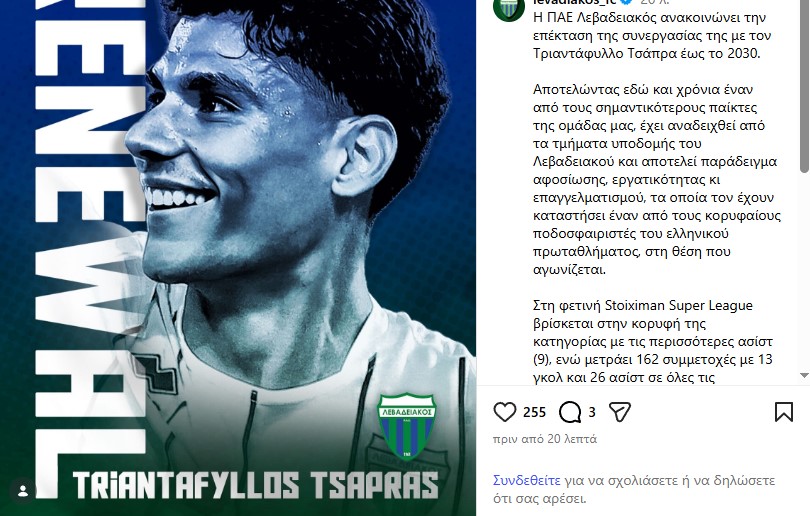“H ΠΑΕ Λεβαδειακός ανακοινώνει την επέκταση της συνεργασίας της με τον Τριαντάφυλλο Τσάπρα έως το 2030.