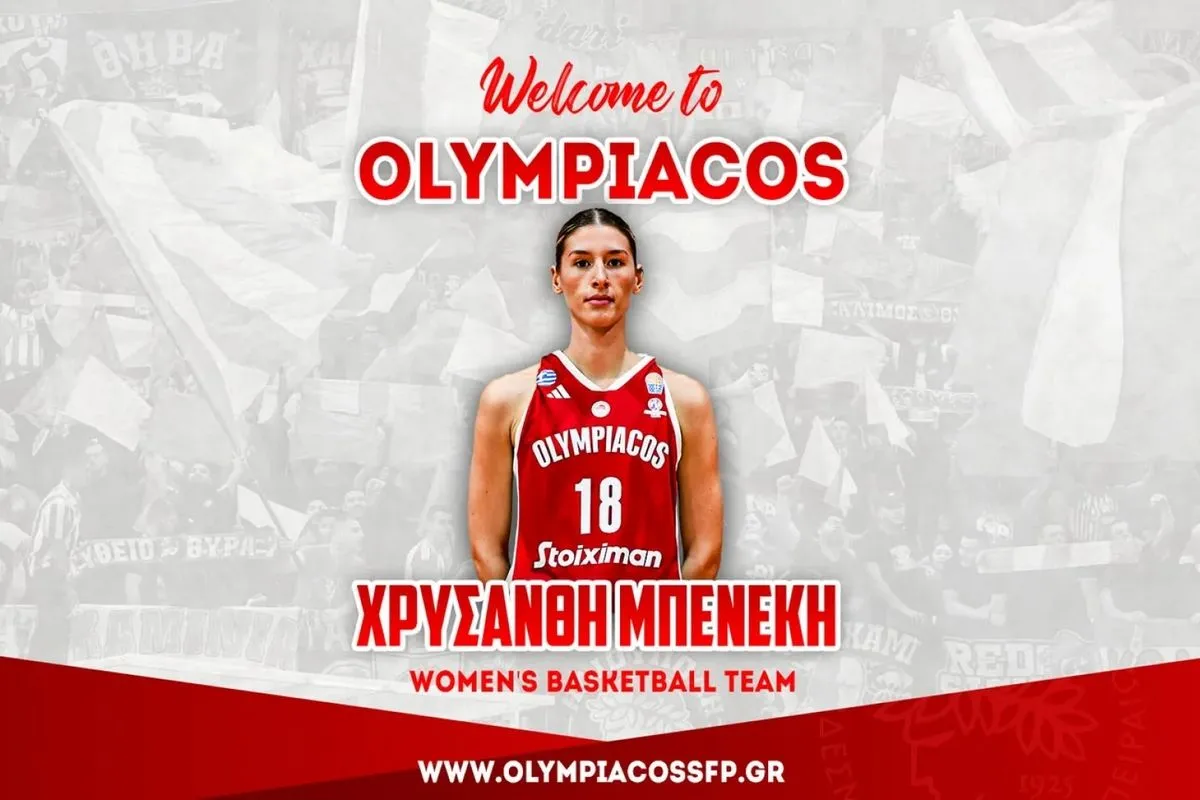 «Ο ΟΛΥΜΠΙΑΚΟΣ Σ.Φ.Π. ανακοινώνει την έναρξη της συνεργασίας του με την Χρυσάνθη Μπενέκη. Η 24χρονη φόργουορντ (ημ. γέννησης 28/8/2001, 1,86μ.) υπέγραψε το νέο της συμβόλαιο και εντάσσεται στο ρόστερ της ομάδας μπάσκετ Γυναικών του συλλόγου.