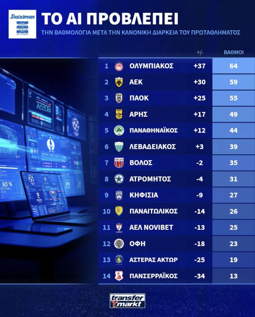 Η τεχνητή νοημοσύνη έκανε τη δίκη της πρόβλεψη για την τελική κατάταξη της φετινής Stoiximan Super League .