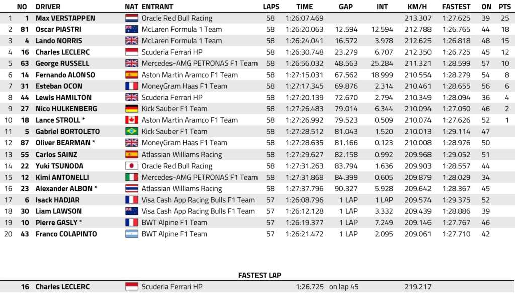 Στο επόμενο διάστημα οι διαφορές άρχισαν να σταθεροποιούνται, με τον Norris να «διώχνει» το βάρος που του άσκησε ο Leclerc, με την μεταξύ τους διαφορά να ανεβαίνει στα 1.5 – 1.7 δευτερόλεπτα, ενώ ο Liam Lawson δέχθηκε ποινή πέντε δευτερολέπτων για απρόβλεπτη οδήγηση.