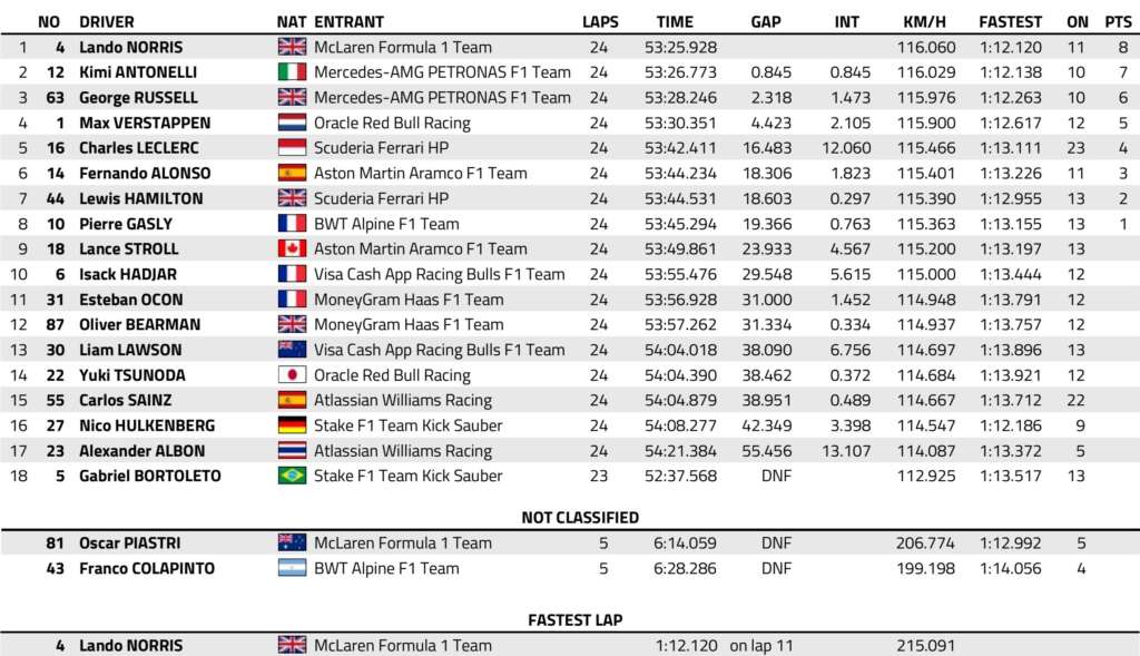 Στην διάρκεια του υπόλοιπου Sprint δεν είχαμε κάποια αλλαγή στις πρώτες θέσεις, παρά την πίεση που άσκησε στο τέλος ο Kimi Antonelli στον Norris, όταν τα μαλακά ελαστικά του Βρετανού άρχισαν να φθίνουν σε απόδοση, όμως πιο πίσω στον 22ο γύρο ο Charles Leclerc κατάφερε να προσπεράσει τον Fernando Alonso, εκμεταλλευόμενος ένα από τα κάμποσα μπλοκαρίσματα του Ισπανού στην πρώτη στροφή, ανεβαίνοντας έτσι 6ος.