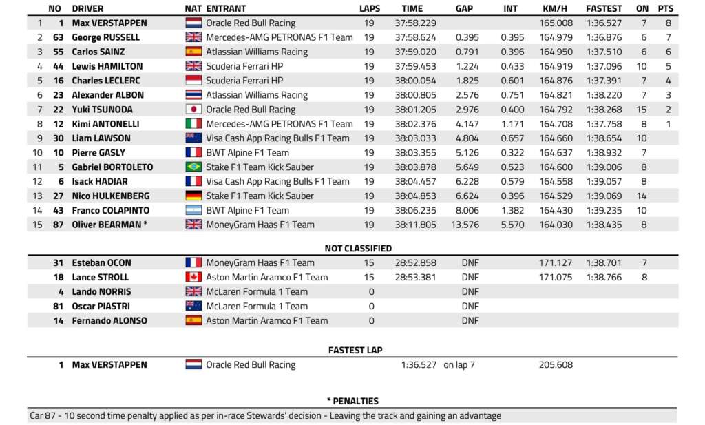 Στο υπόλοιπο του αγώνα είδαμε τον Kimi Antonelli να προσπαθεί να περάσει τον Ollie Bearman, καταφέρνοντάς τα μέσω των αγωνοδικών, οι οποίοι έδωσαν στον οδηγό της Haas ποινή 10 δευτερολέπτων επειδή βγήκε εκτός πίστας στην προσπάθεια άμυνας του, που ίσως τους στοιχίσει και την συμμετοχή στο Γκραν Πρι Μεξικού καθώς συνήθως συνοδεύεται από δύο βαθμούς ποινής, με τον Βρετανό να έχει ήδη 10 από τους 12 που είναι το όριο.
