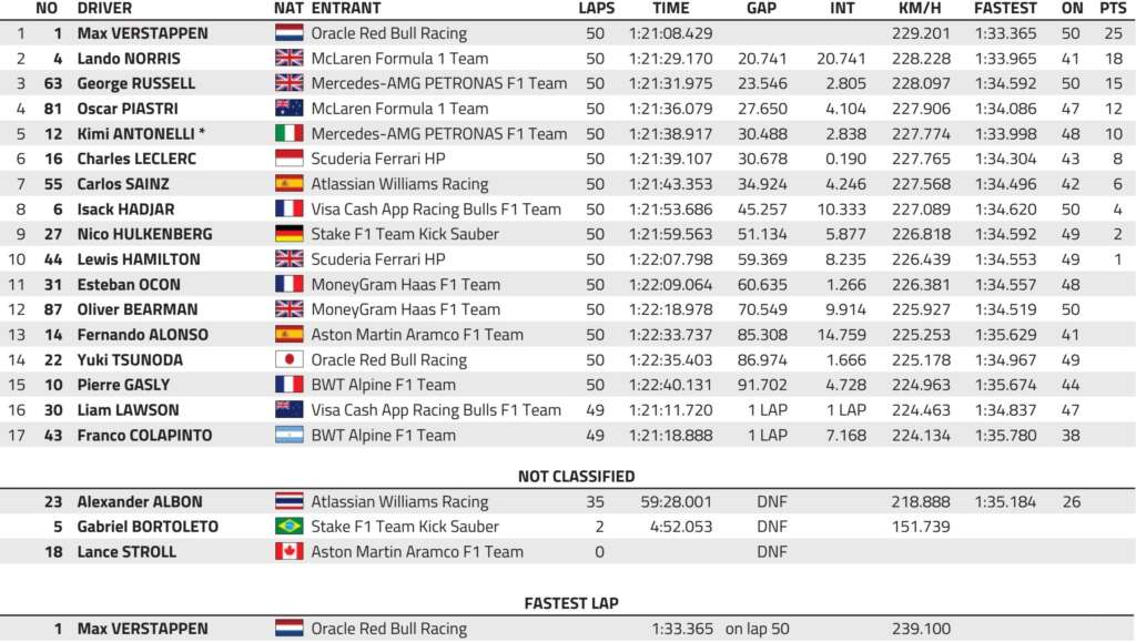 Για το υπόλοιπο του αγώνα ο Piastri δεν μπόρεσε να περάσει εντός πίστας τον Antonelli, ενώ πιο μπροστά ο Lando Norris άρχισε να χάνει ραγδαία ρυθμό στους τελευταίους γύρους, λόγω απροσδιόριστου για την ώρα προβλήματος, όντας πολύ τυχερός που και ο Russell ήταν αρκετά πιο πίσω και δεν μπόρεσε να τον απειλήσει για την 2η θέση. Έτσι η οποιαδήποτε υπόνοια απειλής έλαβε τέλος και ο Max Verstappen κατέκτησε άνετα την 69η νίκη της καριέρας του, μένοντας παράλληλα ζωντανός στην μάχη του τίτλου, όντας πλέον 41 βαθμούς πίσω από τον Βρετανό!