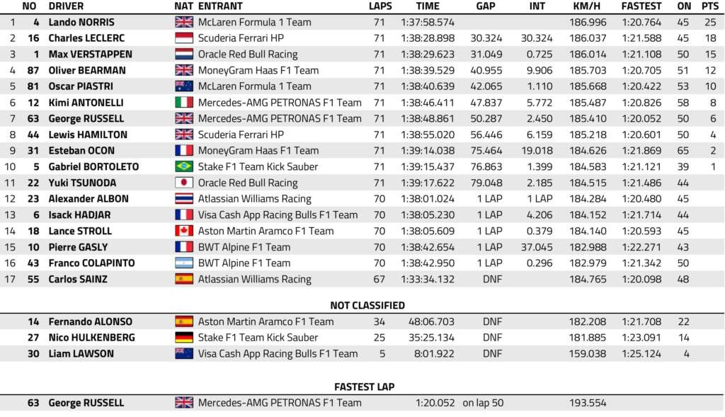 Ο Αυστραλός όμως έδειξε το καλό του πρόσωπο καταφέρνοντας έτσι με προσπεράσματα εντός πίστας αλλά και στα pits, να βρεθεί 5ος, μπροστά από τις δύο Mercedes, στερούμενος και αυτός την ευκαιρία να επιτεθεί στον καταπληκτικά 4ο Bearman, λόγω του VSC, το οποίο βγήκε λόγω της εγκατάλειψης του Carlos Sainz, που ήταν ο ένας από τους τρείς οδηγούς μαζί με τους Nico Hulkenberg και Liam Lawson που εγκατέλειψαν τον αγώνα. Αυτό το VSC πιθανώς να είναι και κρίσιμο για την συνέχεια του πρωταθλήματος, καθώς και ο Verstappen και o Piastri θα μπορούσαν πιθανώς να συγκεντρώσουν τρείς και δύο παραπάνω βαθμούς αντίστοιχα.