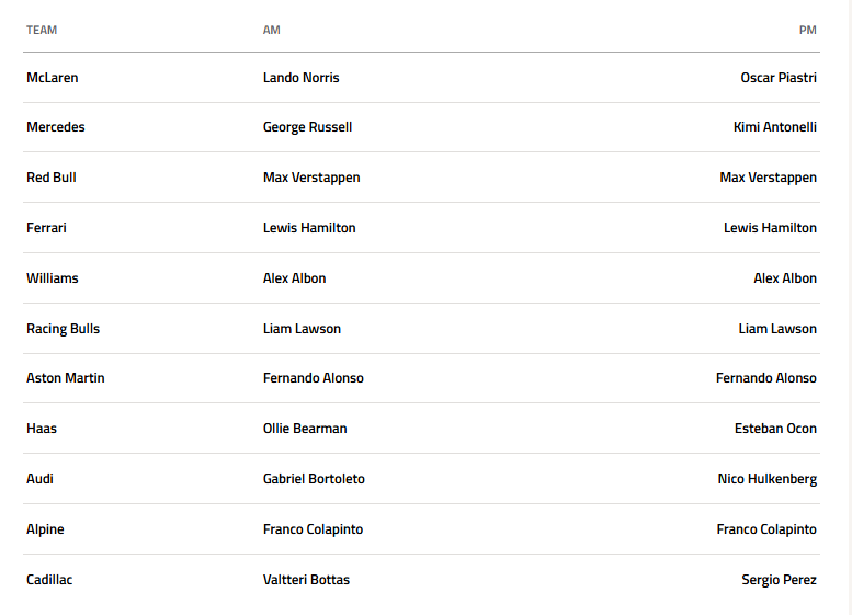 Αυτή η καινοτόμα αεροτομή όμως δοκιμάστηκε μόλις για πέντε γύρους, με απροσδιόριστα προβλήματα να κρατούν καθηλωμένο τον Βρετανό στο γκαράζ για όλο το πρωινό σκέλος, ενώ στο απογευματινό χρησιμοποιήθηκε ξανά η πιο «κανονική» πτέρυγα. Καθυστερήσεις και μικροπροβλήματα είχαν και οι Cadillac και Racing Bulls, με τον Liam Lawson να καταφέρνει μόλις 27 γύρους στο πρωινό σκέλος, ενώ παρά την καθυστέρηση σχεδόν δύο ωρών για να εμφανιστεί στην πίστα, ο Valtteri Bottas συμπλήρωσε 58.