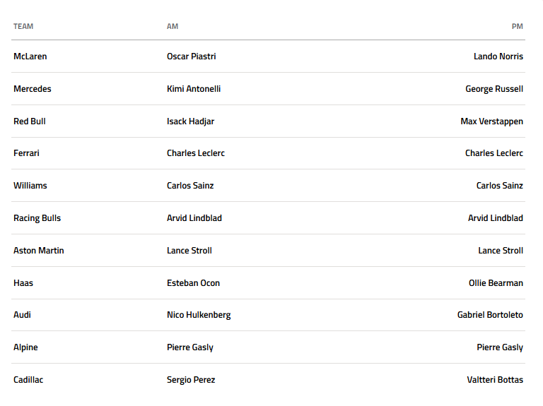 2ος βρέθηκε ο προαναφερθείς Antonelli, 227 χιλιοστά πιο αργός, ενώ 3ος ο Oscar Piastri, έξι δέκατα από την κορυφή και με 66 γύρους ολοκληρωμένους. Τους περισσότερους γύρους από όλους συμπλήρωσε ο Esteban Ocon με 82.
