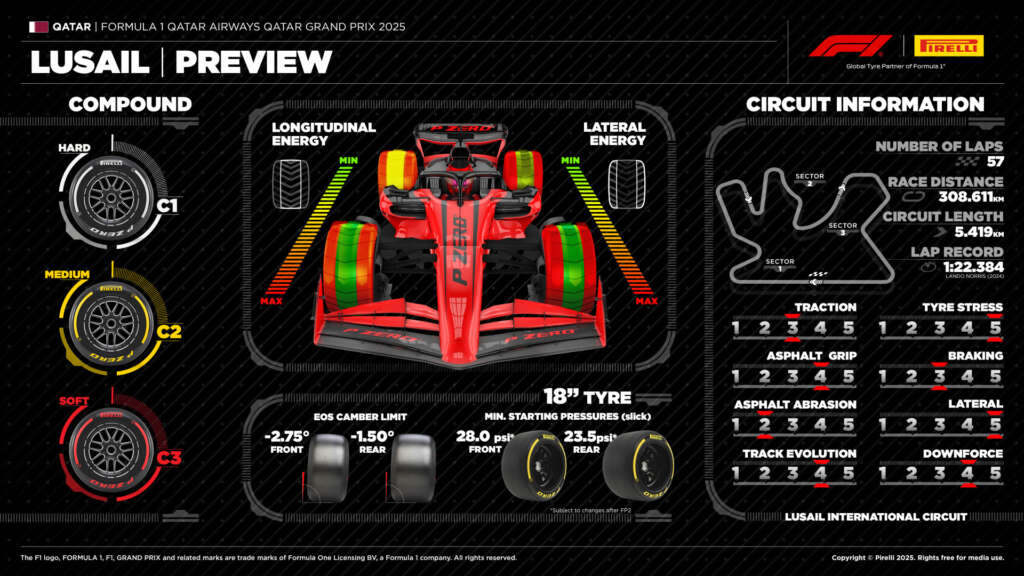 Οι περισσότερες στροφές στην πίστα Lusail είναι υψηλής ταχύτητας, πράγμα που σημαίνει ότι τα ελαστικά έχουν λίγο χρόνο για να ανακάμψουν και το τμήμα που τα καταπονεί περισσότερο είναι από τις στροφές 12 έως 14. Η επιφάνεια της πίστας, η οποία είναι αρκετά λεία, συνήθως οδηγεί σε σχηματισμό κόκκων που συμβάλλει στην παραγωγή υψηλού ποσοστού φθοράς στα ελαστικά.